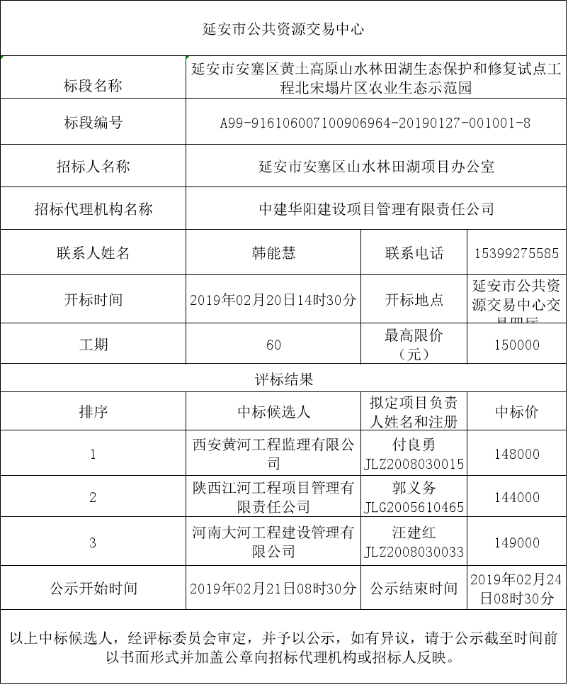 延安市安塞區(qū)黃土高原山水林田湖生態(tài)保護和修復(fù)試點工程北宋塌片區(qū)農(nóng)業(yè)生態(tài)示范園配套提升工程(監(jiān)理標段)中標候選人公示